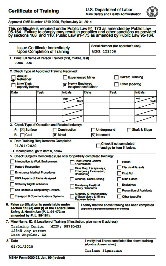 Part 46 on the other hand covers Non-Metal and are very specific types of mines. NOTE: If you are a contractor at a Part 46 mine you may also be under Part 48. Tha’s why it is recommended to take the Part 48 training which will also give you access to mines under Part 46 jurisdiction. For Part 46 Surface Miner Training, MSHA allows for use of either the 5000-23 or a form that will be considered compliant if it contains five specified items of information. If your workers fall into this situation, please register as Part 48 B using the following link: